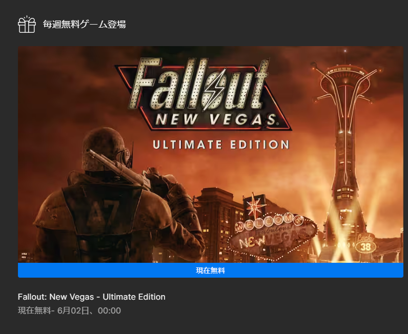 EPIC Gamesでは現在メガセールを開催中で多くのゲームがお得に手に入れられる期間になっていますが、本日5月26日(金)0:00時より核戦争後のポストアポカリプスな世界を舞台にした人気オープンワールドRPGの名作「Fallout: New Vegas – Ultimate Edition」(2010年10月19日発売)の無料配布が始まります。6月2日(金)0:00時までとなっており、次のゲームに切り替わってしまいますので今のうちに受け取っておきましょう!